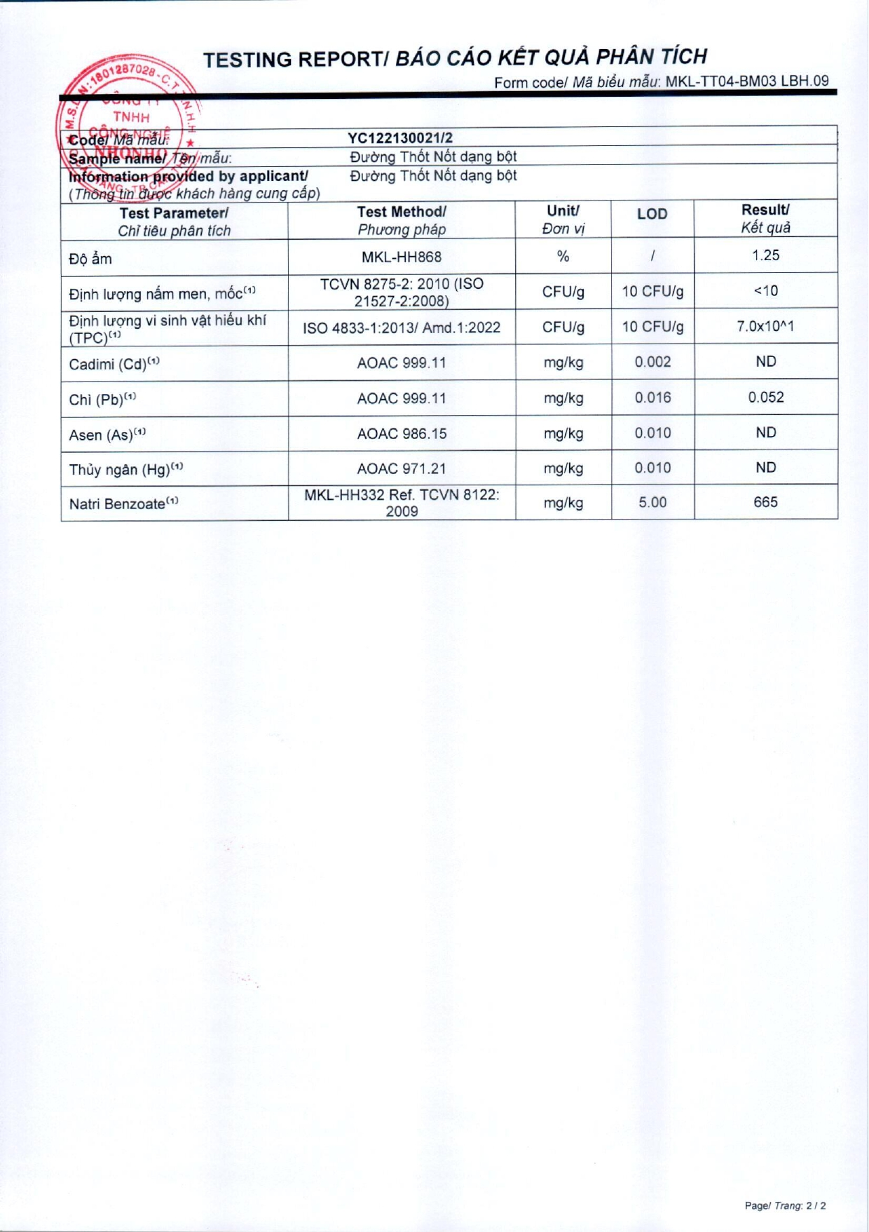 Chỉ tiêu chất lượng: không sử dụng đường hóa học